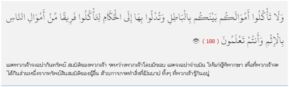 2-188 Posted on November 19, 2013 by Isares Mahamad(Muhammad Azmii) Leave a comment Like Loading... Previous Next Return to Gharar ความไม่โปรงใส ข้อห้ามในการเงินอิสลาม