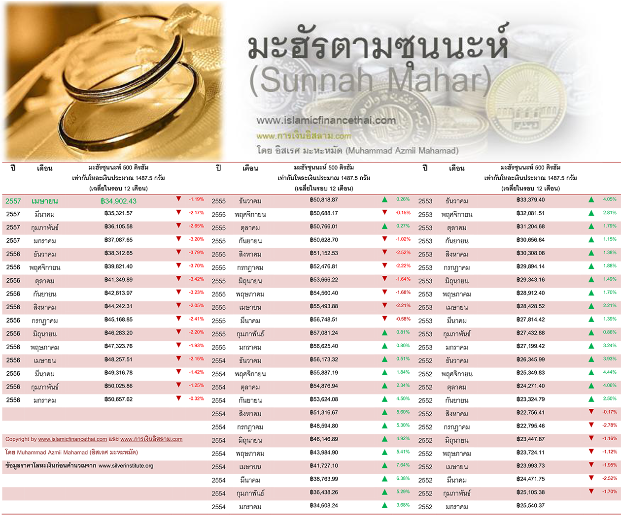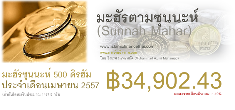 มะฮัรตามซุนนะห์ของท่านนบี (ศ็อลลัลลอฮุอะลัยฮิวะซัลลัม) คือ 500 ดิรฮัม จึงใช้การคำนวณมูลค่า 500 ดิรฮัมจากราคาของโลหะเงินในตลาดโลก ซึ่ง 500 ดิรฮัม จะเท่ากับโลหะเงิน 1487.50 กรัม จะสามารถคำนวณมะฮัรซุนนะห์ ของเดือนเมษายน 2557 ได้เท่ากับ ฿34,902.43 บาท ลดลงจากเดือนมีนาคม 2557 -1.19%