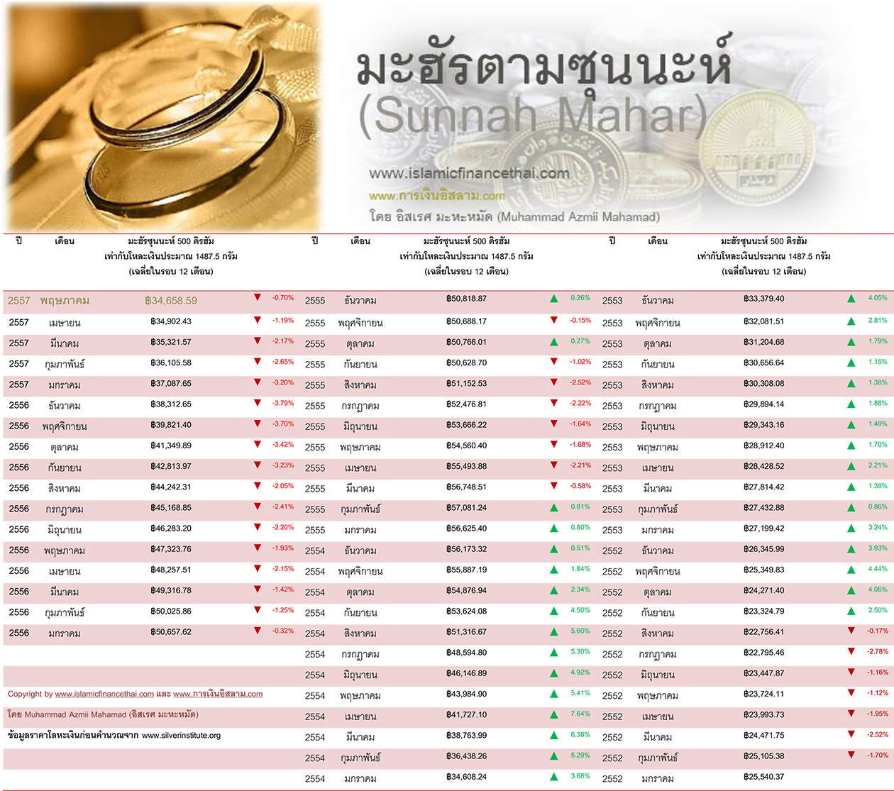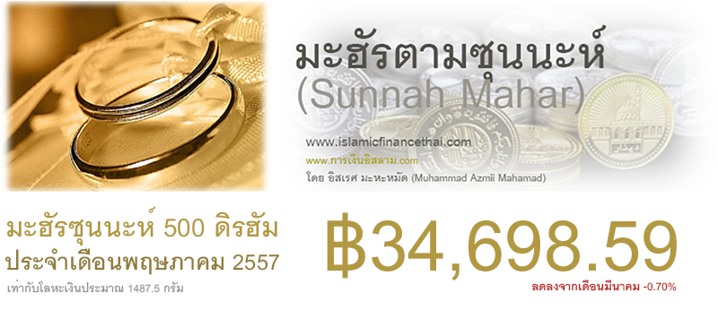 มะฮัรตามซุนนะห์ของท่านนบี (ศ็อลลัลลอฮุอะลัยฮิวะซัลลัม) คือ 500 ดิรฮัม จึงใช้การคำนวณมูลค่า 500 ดิรฮัมจากราคาของโลหะเงินในตลาดโลก ซึ่ง 500 ดิรฮัม จะเท่ากับโลหะเงิน 1487.50 กรัม จะสามารถคำนวณมะฮัรซุนนะห์ ของเดือน พฤษภาคม 2557 ได้เท่ากับ ฿34,658.59 บาท ลดลงจากเดือนมีนาคม 2557 -0.70%